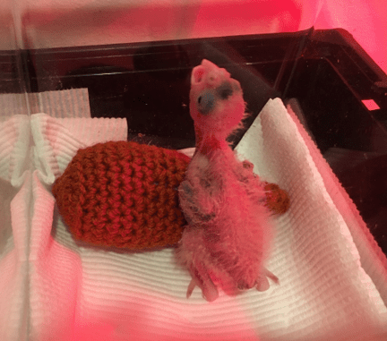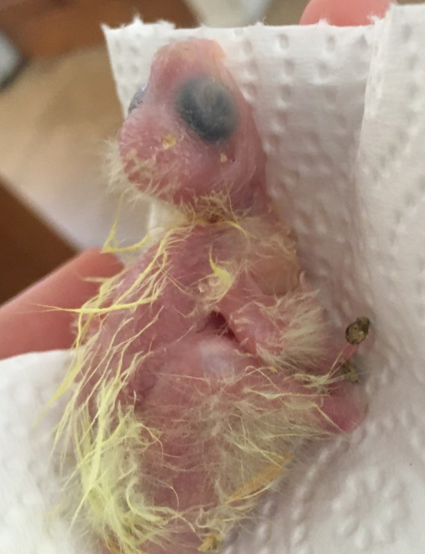 During this time, tiny signs of feather growth (such as slight colouring on the wings and top of the head) may appear. The chick may begin to improve balance and may be able to stand properly upright to beg for food. A chick at this age should be weighing around 30-50 grams and should be easier to pick up and handle. Chicks at this age, however, will still be unlikely to have any control over their eating habits and will still be very easy to over-feed. They will still require frequent feedings around every 3-4 hours, with a rest period overnight to allow the crop to fully empty. They will also still have a very weak immune system and all feeding tools will need to be thoroughly cleaned and sterilized with each feed.